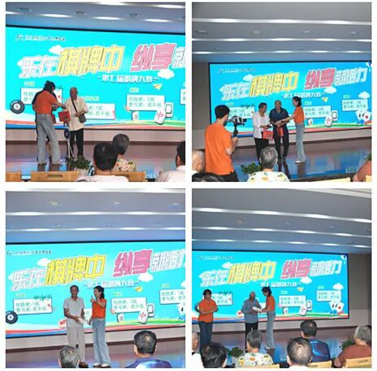 长者棋牌大赛是本次活动的“温情主场”。赛场被划分成麻将、象棋、扑克、台球四个区域,长者选手们各展所长,沉浸在属于自己的 “竞技时光” 里:麻将桌前,选手们指尖起落间,尽显布局智慧;象棋棋盘上,楚河汉界交锋,每一步落子都藏着深思熟虑;扑克桌旁,欢声笑语不断,趣味玩法让长者们不时开怀大笑;台球桌边,选手们站姿优雅,精准推杆,每一次进球都引来同伴的喝彩。