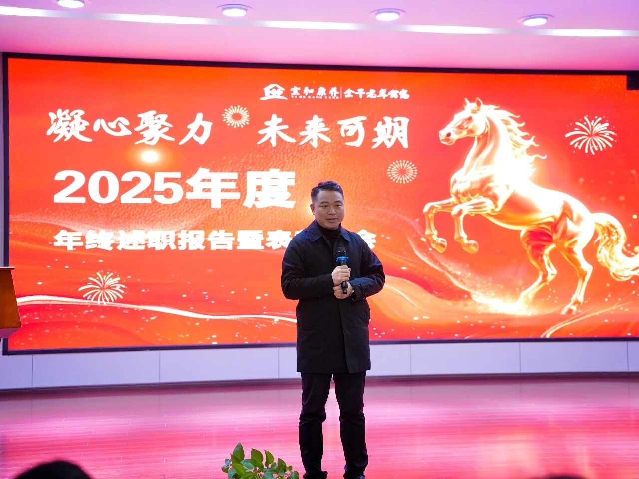 1 月 24 日,余干老年公寓 2025 年终总结暨表彰大会在夕阳红文化活动中心影音大厅隆重举行。宜和康养董事长徐雨亮莅临指导,公寓全体行政人员齐聚一堂,复盘年度成效,共绘发展蓝图。